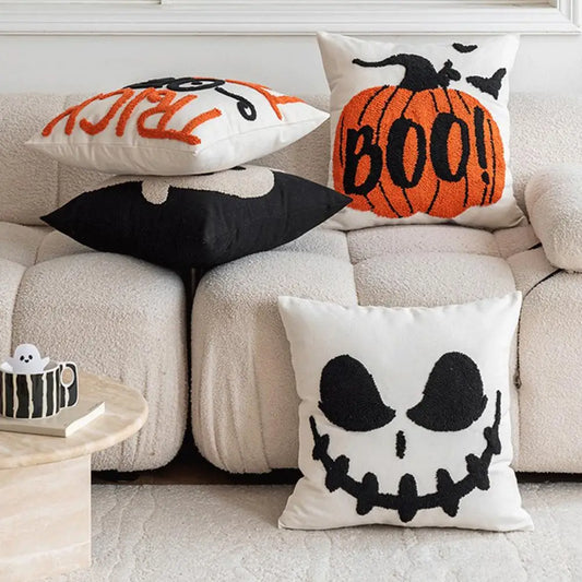 Our Halloween-themed pillows bring a burst of festive fun and comfort to your bedroom. Rest your head on pillows featuring cheerful jack-o'-lanterns, mischievous skeletons, or playful black cats. These pillows are designed for both style and coziness, making them perfect for your bed, a favorite chair, or a cozy reading nook. With intricate, seasonal designs, they add the ultimate finishing touch to your Halloween bedroom decor.