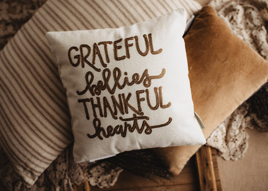 Grateful Bellies Thankful Hearts Thanksgiving Pillow – Cozy Up with Gratitude