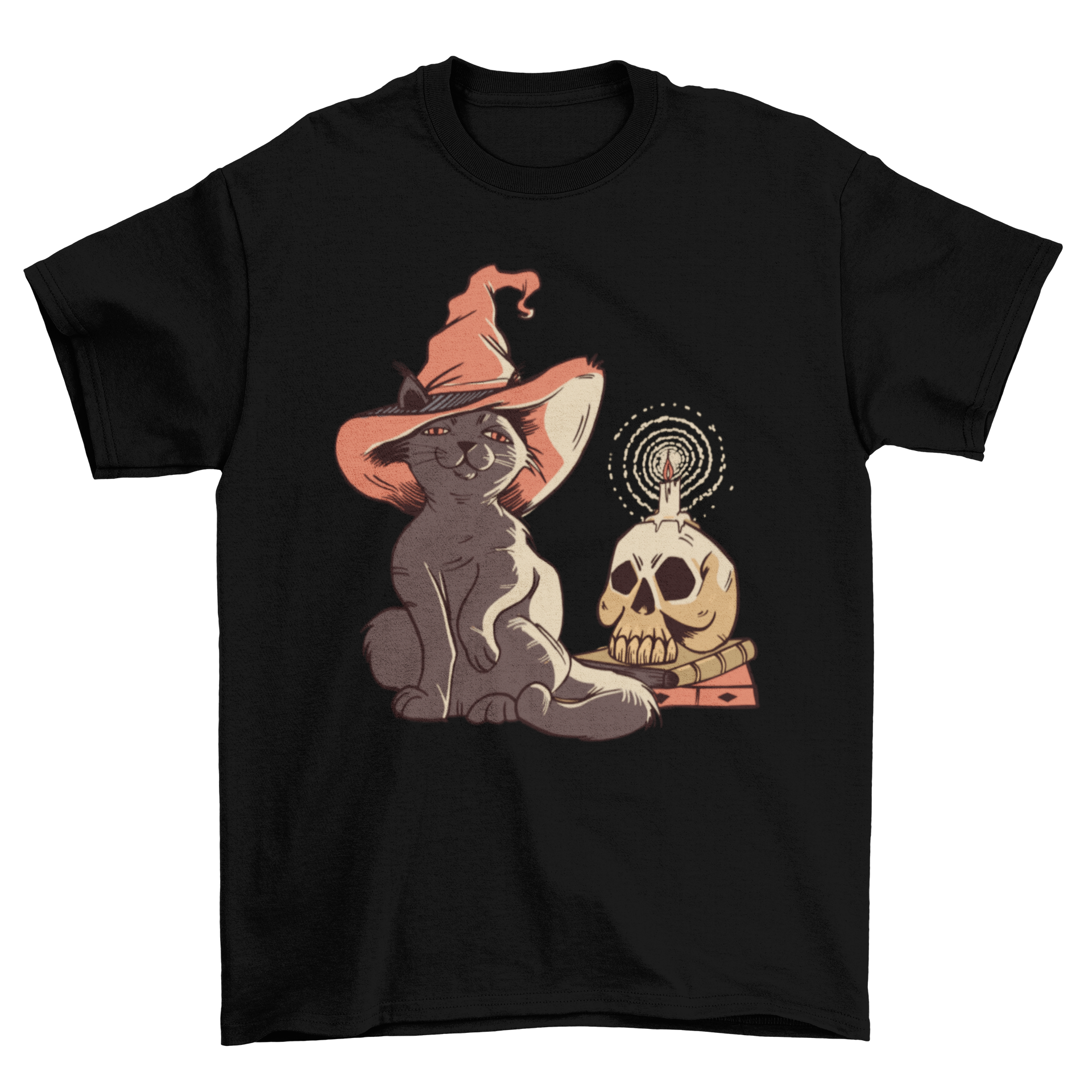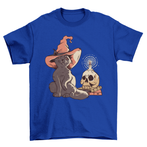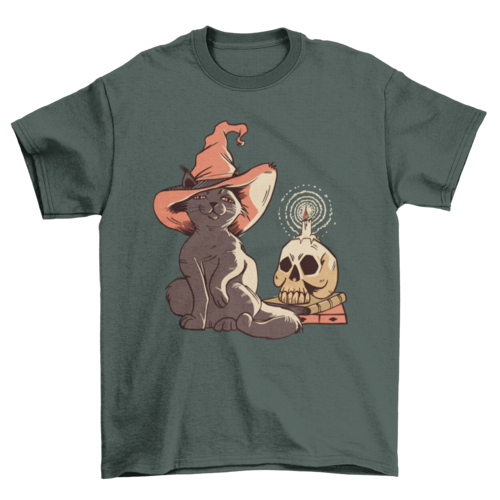 Add a bewitching twist to your wardrobe with the Halloween Witch Cat T-shirt—a perfect mix of spooky and cute! This standout shirt features an enchanting illustration of a black cat wearing a witch’s hat, perched next to a skull with a glowing candle. It captures the perfect Halloween vibe: a little eerie, a little magical, and a lot of style.