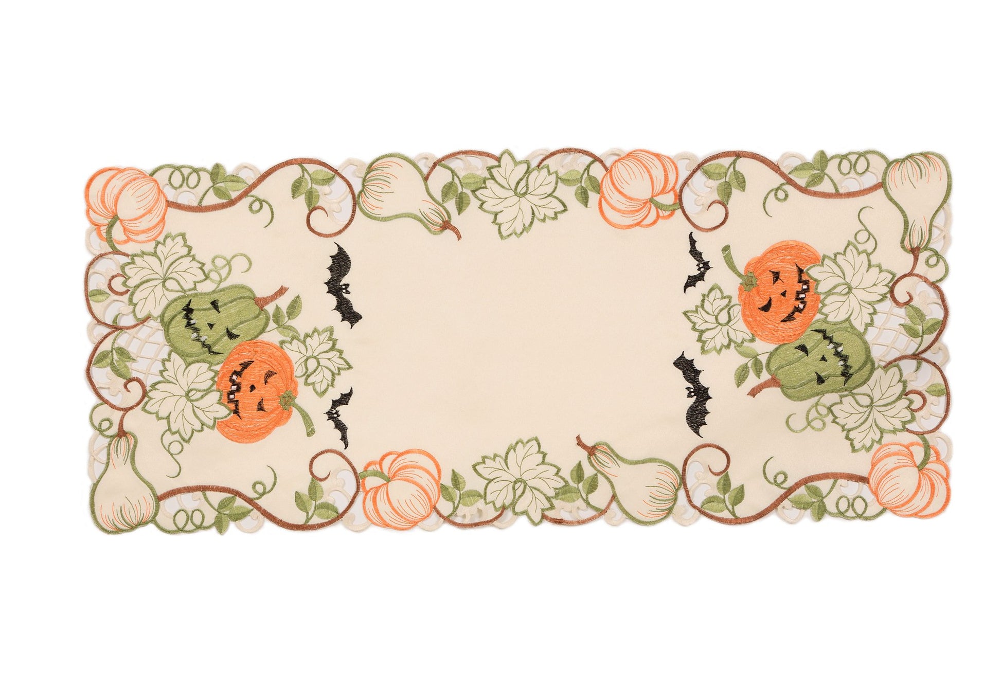 - Design: Smiling jack-o'-lanterns in detailed embroidery and classic cut work