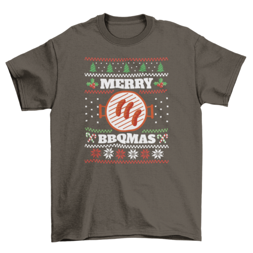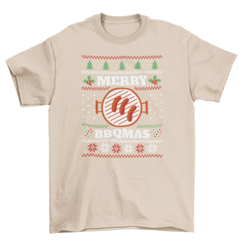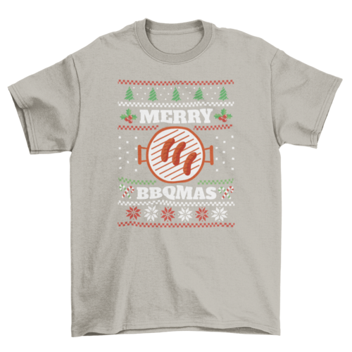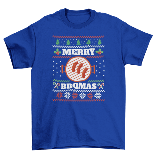- Design: Ugly Christmas sweater style with sizzling sausages and “Merry BBQMas” quote