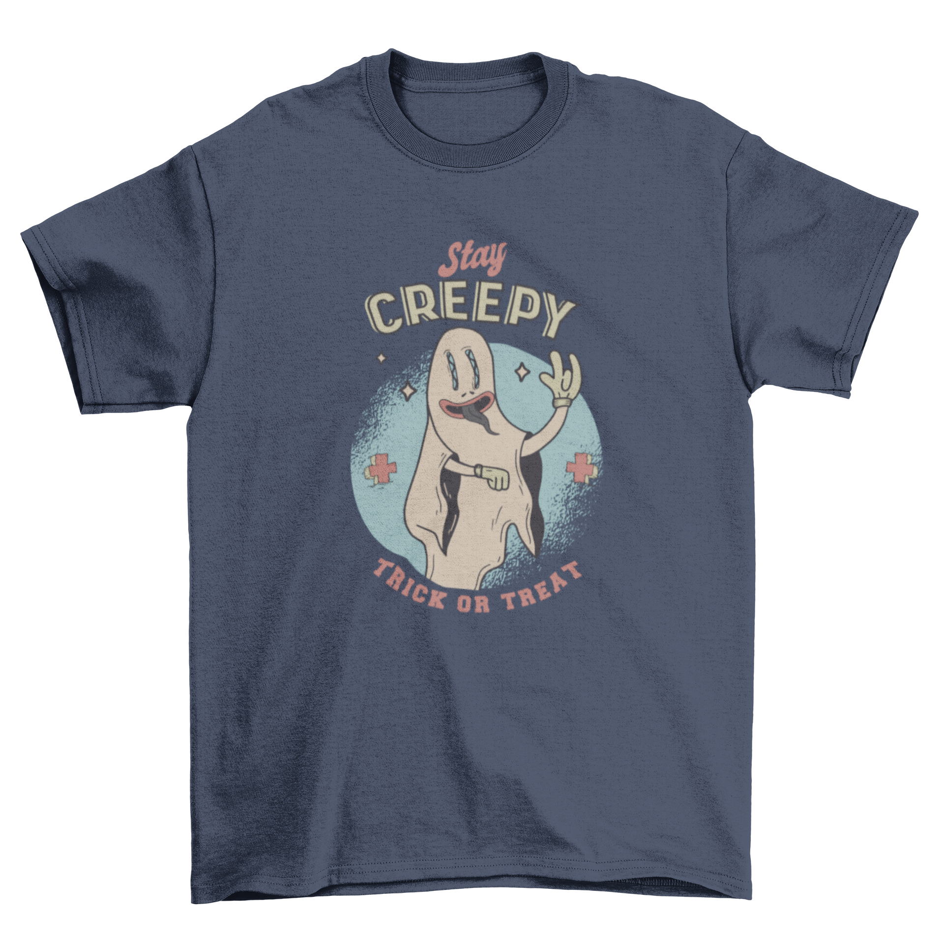 | Design | Retro ghost illustration with the phrase “Stay creepy trick or treat” |